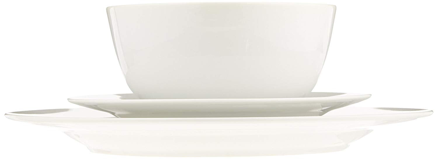 Bring an elegant sense of contemporary style to the kitchen, dining room, or even the breakfast nook with this everyday AmazonBasics dinnerware set. A nice choice for family meals and casual gatherings, the 18-piece collection includes 6 place settings, each with a 10.5-inch dinner plate, 7.5-inch dessert plate, and 5.5 x 2.75-inch soup/salad bowl.