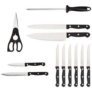 The AmazonBasics 14-piece knife set helps facilitate gourmet results, whether cooking for one or for a crowd. The popular all-purpose chef's knife features a curved blade for chopping with a smooth, back-and-forth rocking motion, while its wide blade surface allows for conveniently scooping up chopped veggies or minced herbs and transporting them quickly from the cutting board to a pot or pan on the stovetop.