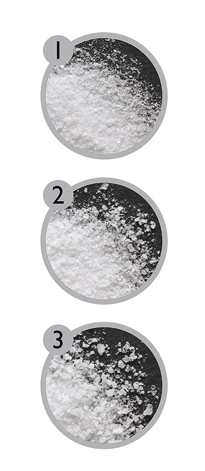 ● Seleccione de forma conveniente entre 6 niveles de molienda preestablecidos para pimienta y 3 para sal girando la base