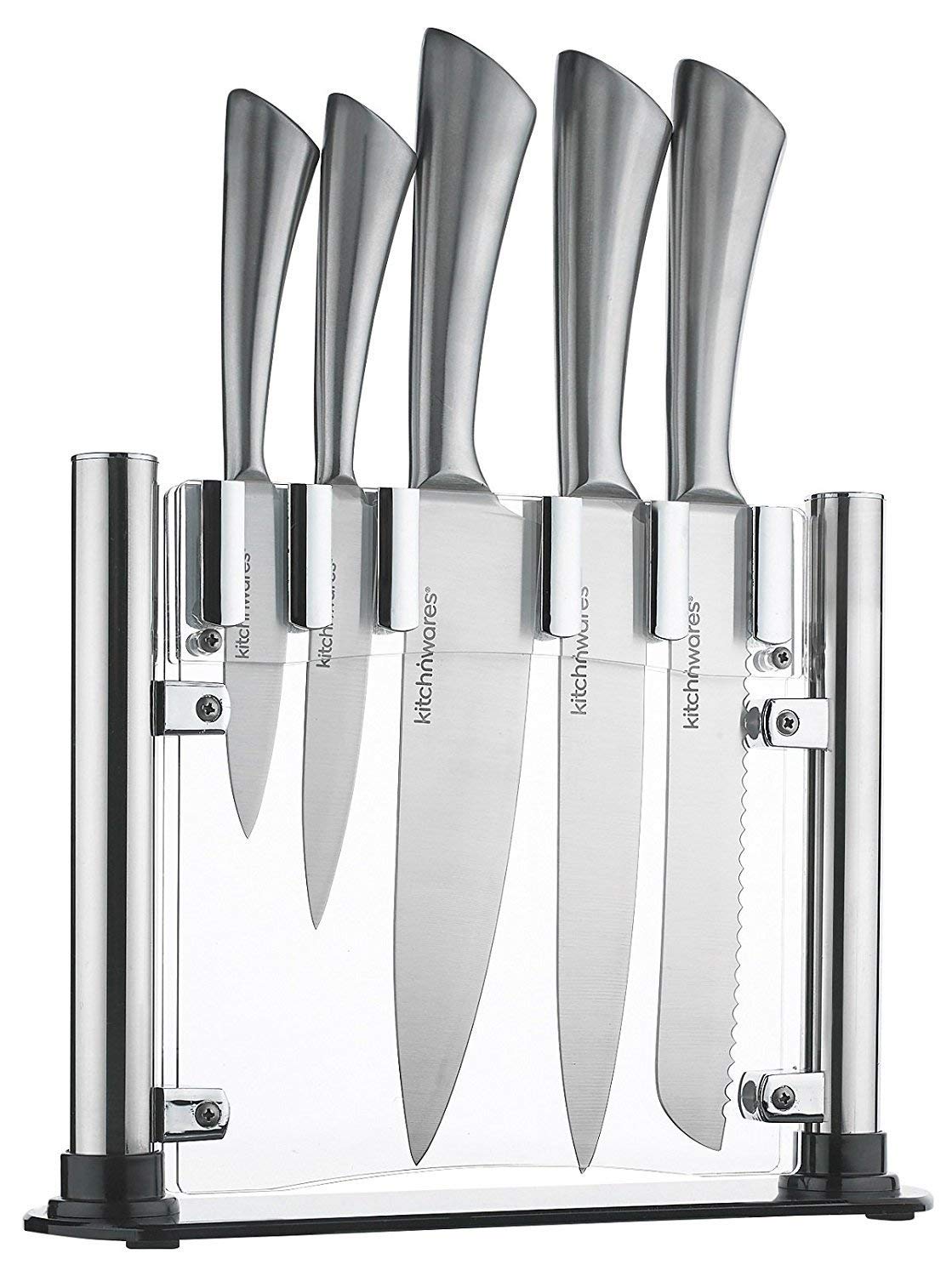 Kitch N' Wares - Juego de cuchillos con soporte acrílico (acero inoxidable, 6 piezas, para cortar y tallar, ideal para cocinar en casa y en la cocina comercial)