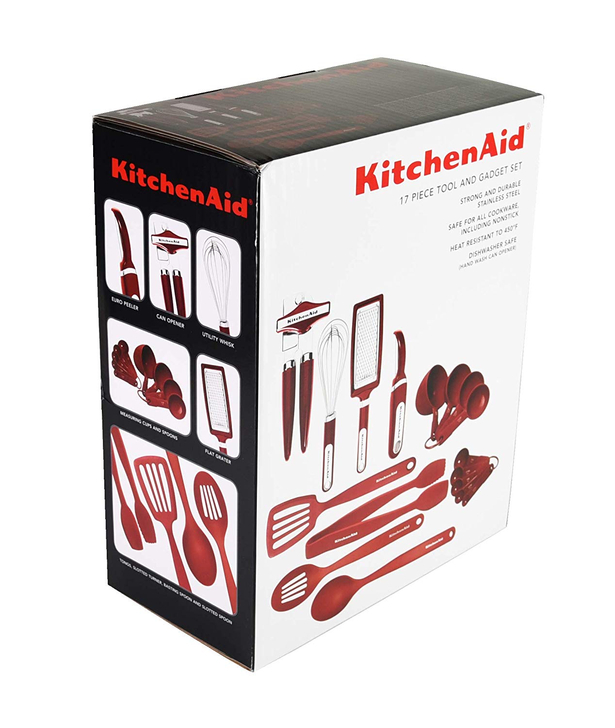 ● Gadgets included: flat grater, euro peeler, can opener, utility whisk, measuring cups and spoons